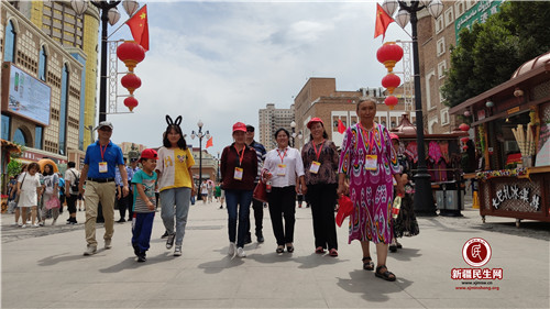 在国际大巴扎,看着来自全国各地的游客随着民族特色音乐跳起舞蹈来,结对亲戚们被这样的场景吸引,也纷纷加入其中,大家载歌载舞,欢快的跳着。“以前都是在电视上看到国际大巴扎热闹的景象,一直都有向往来这个地方的愿望,今天我也来到了这里,看到了现代化的大巴扎,太漂亮了。”亚生·吾斯曼激动地说